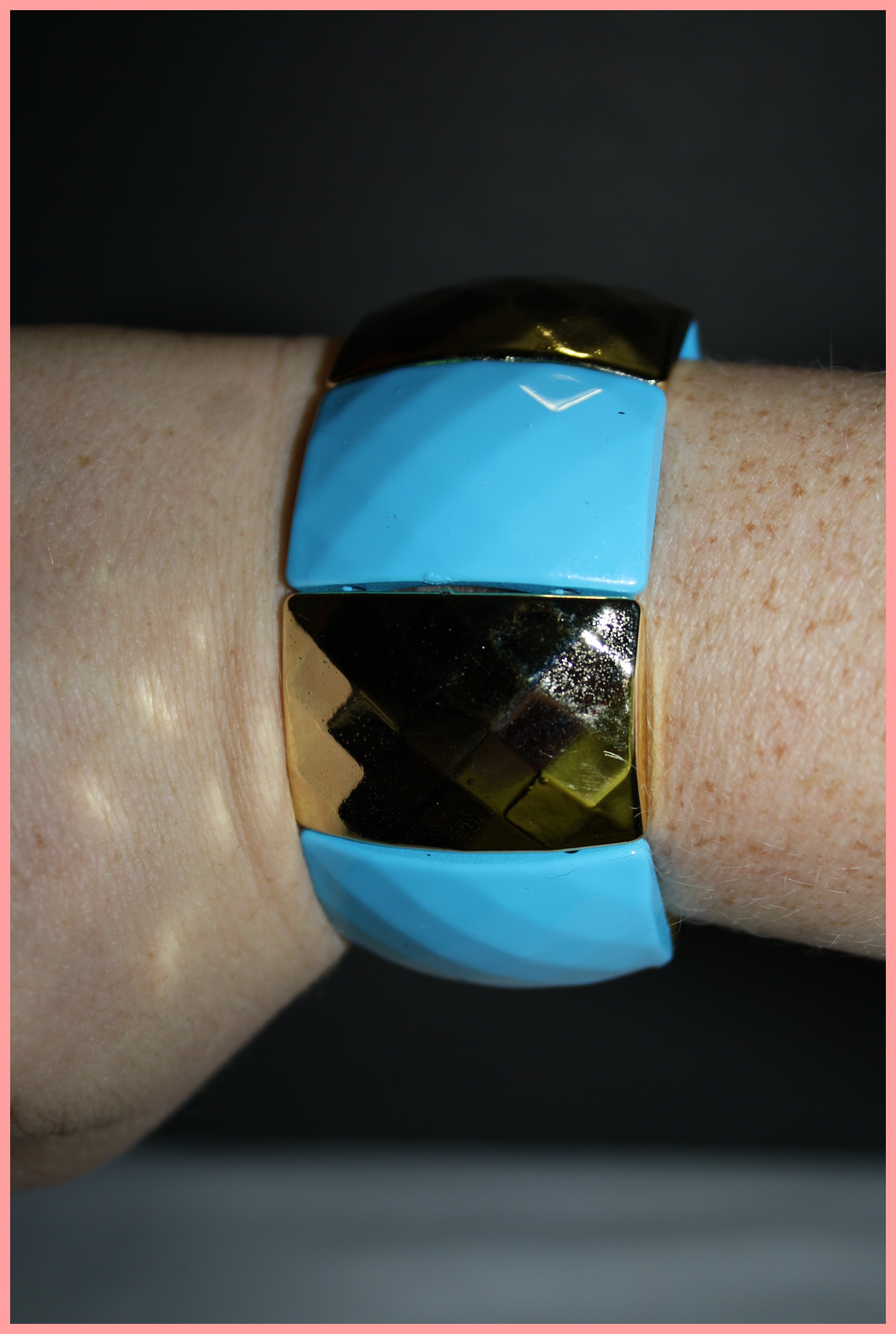 Chunky baby blue and gold large plastic rectangles with gold plastic spacers in between.