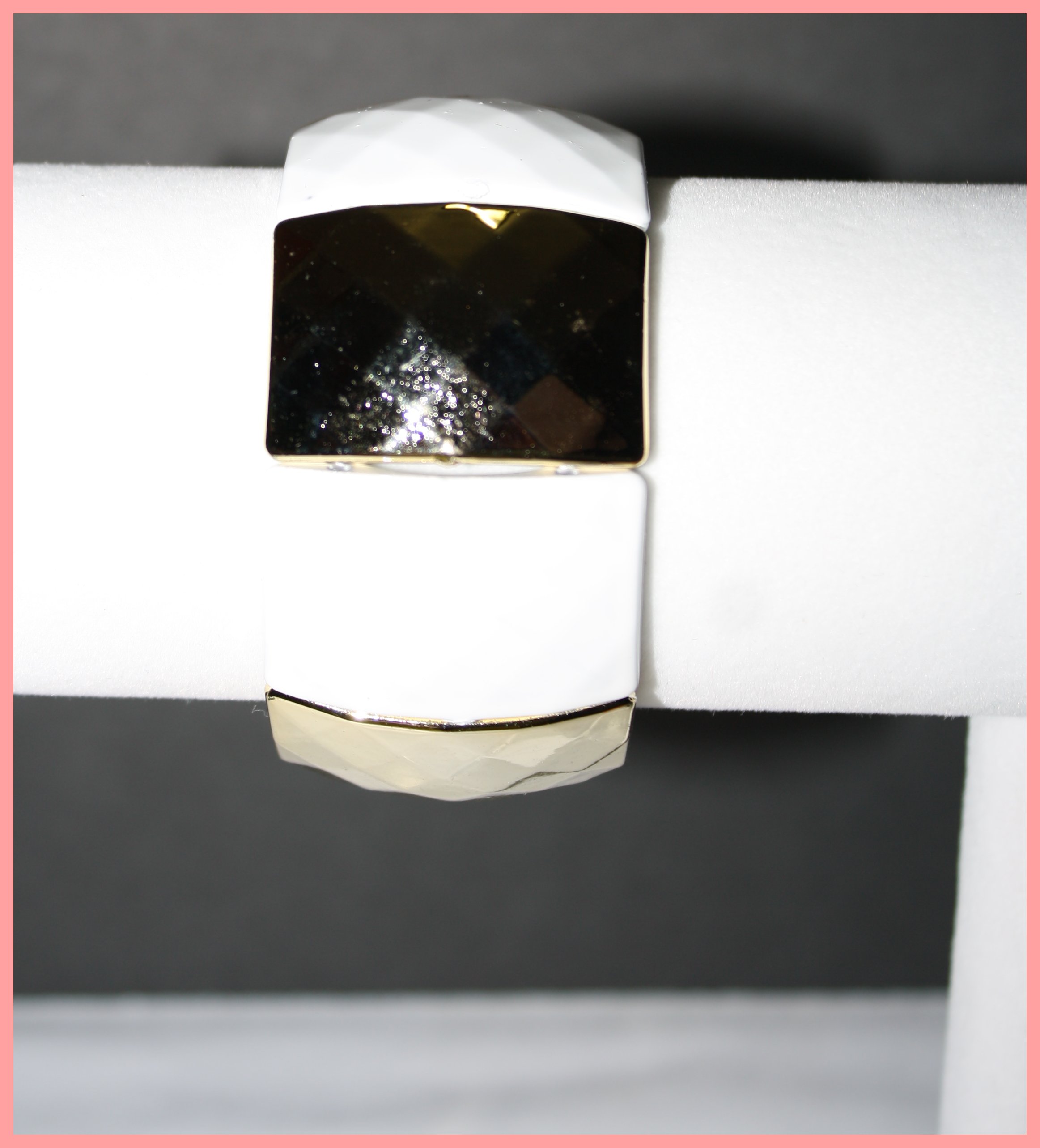 Chunky white and gold large plastic rectangles with gold plastic spacers in between.