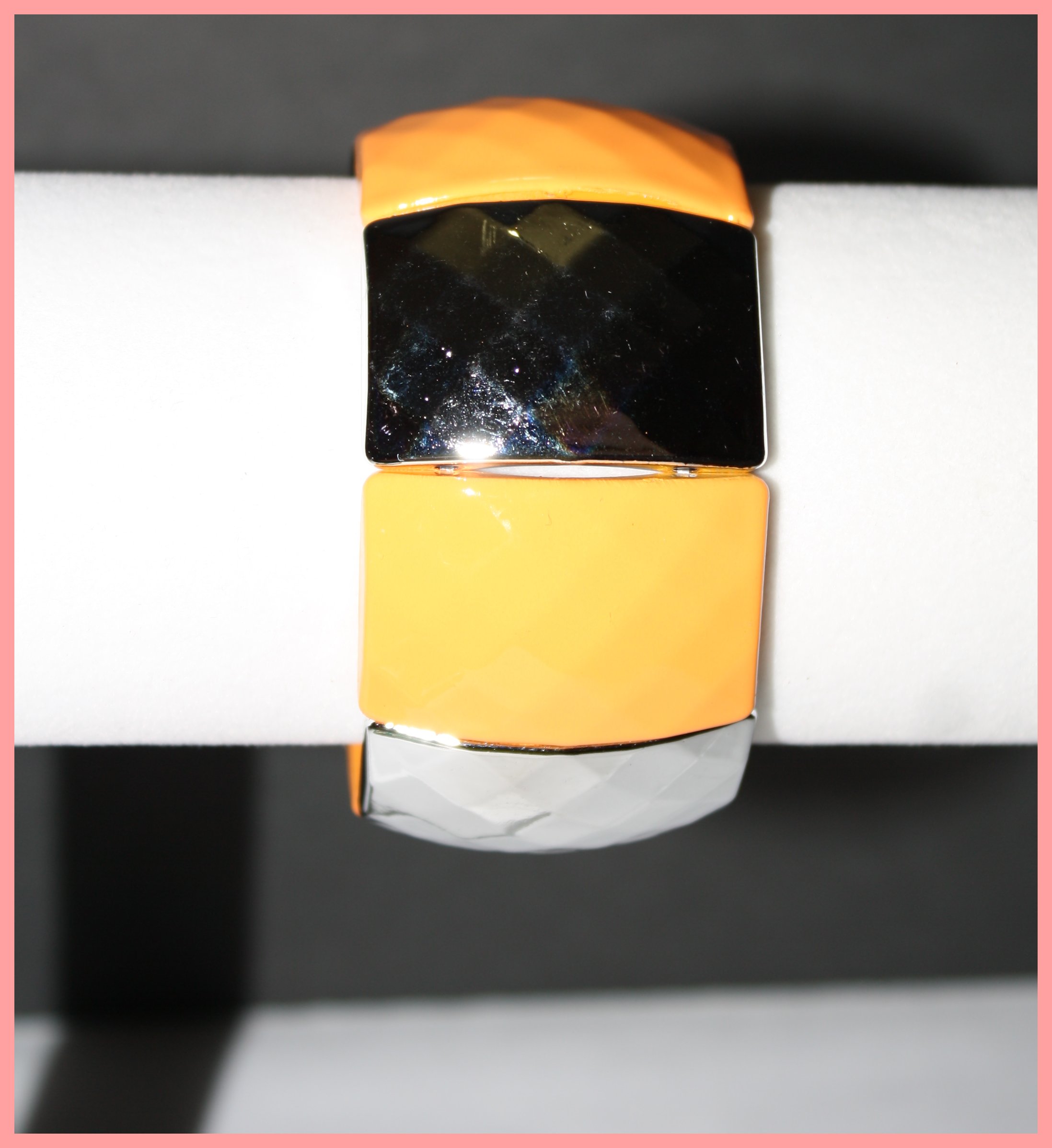 Chunky orange and silver large plastic rectangles with silver plastic spacers in between.
