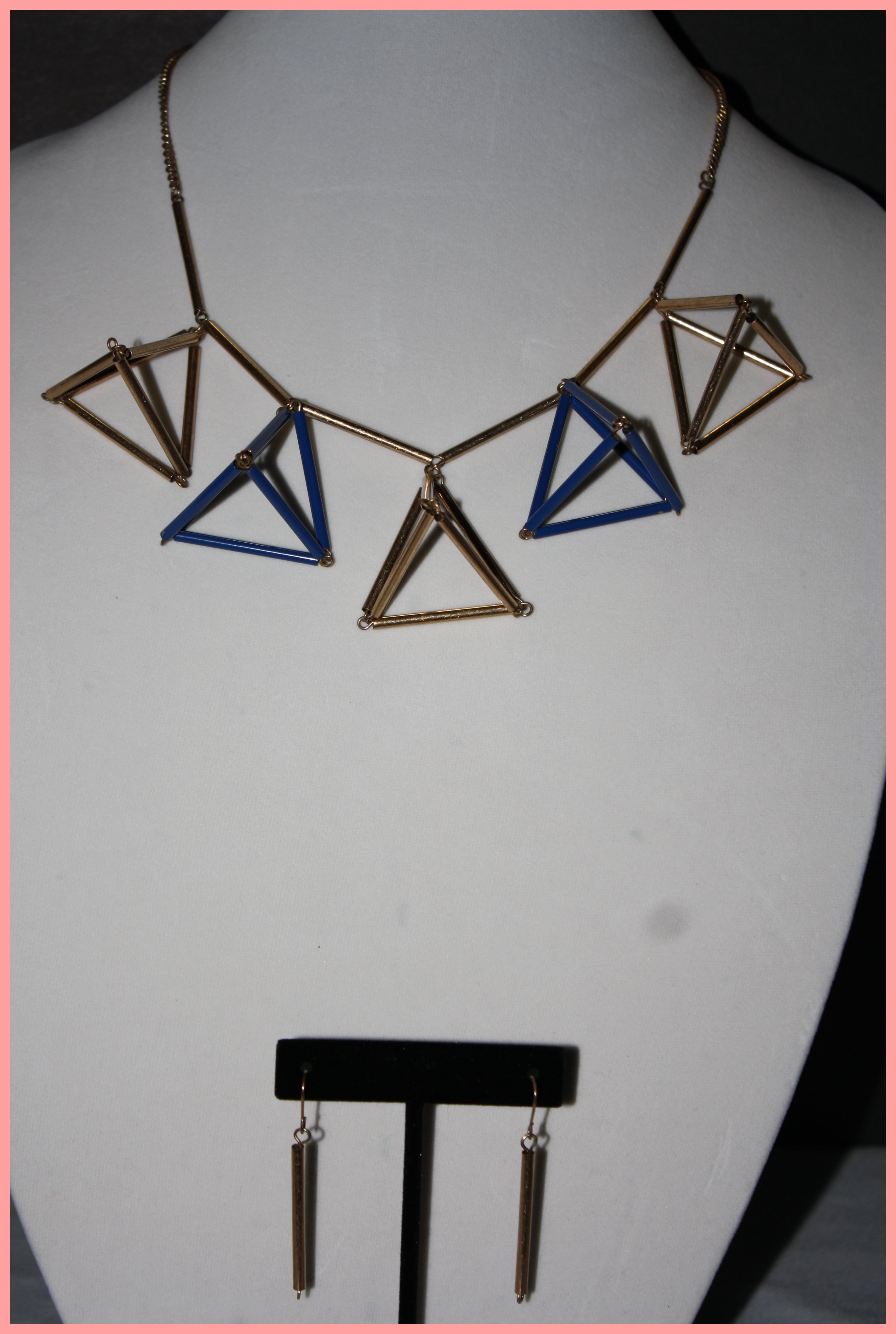 Make a statement by wearing this cute and funky triangle necklace with matching earrings.