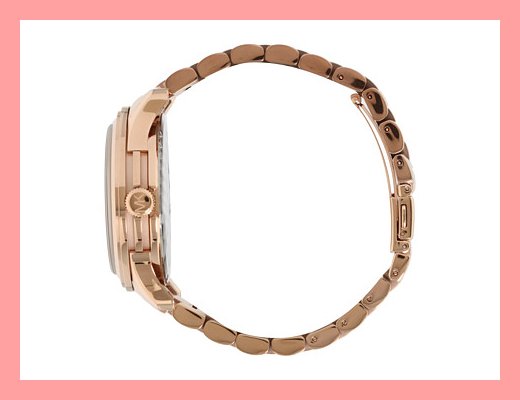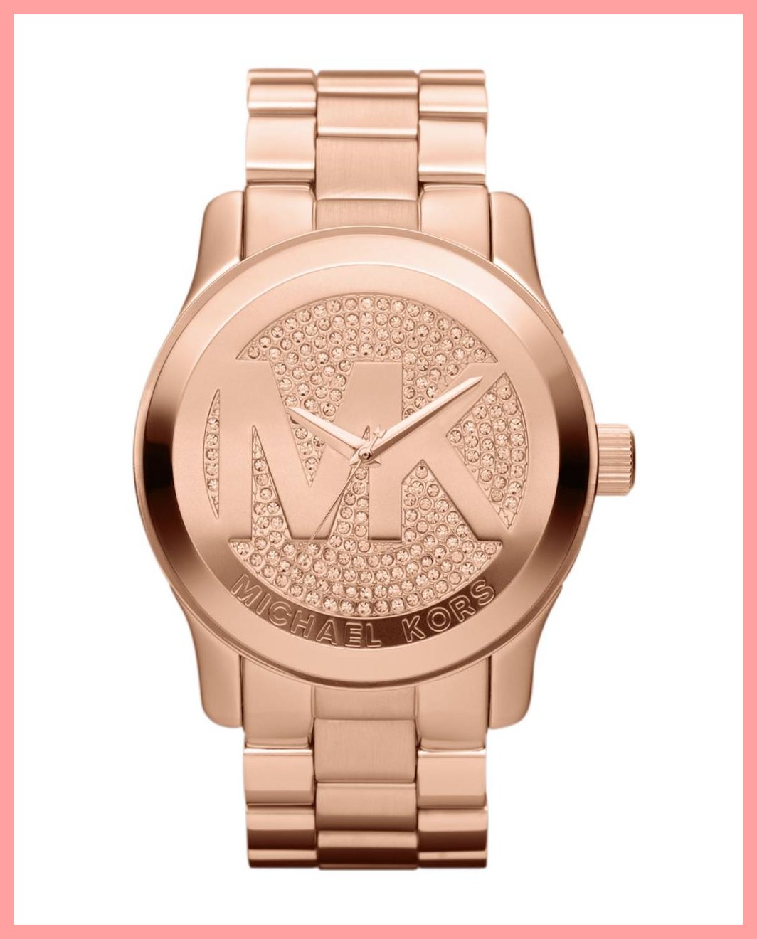 Polished rose-gold-tone hands and sweep seconds, Rose-gold-tone pave crystal dial with oversize 'MK' logo and engraved brand logo, Chunky polished rose-gold-ion-plated stainless steel bracelet with adjustable links and push-button-clasp, Polished rose-gold-ion-plated stainless steel bezel❤