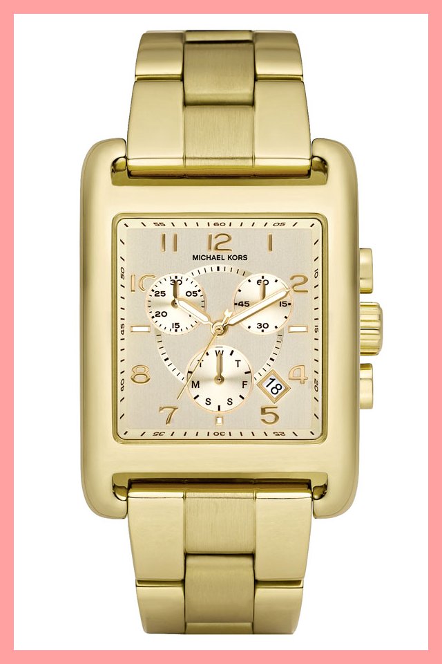 We love how the square-shaped face of this timepiece gives it a modern feel, while the shiny gold and accents are Michael Kors at his classic best.