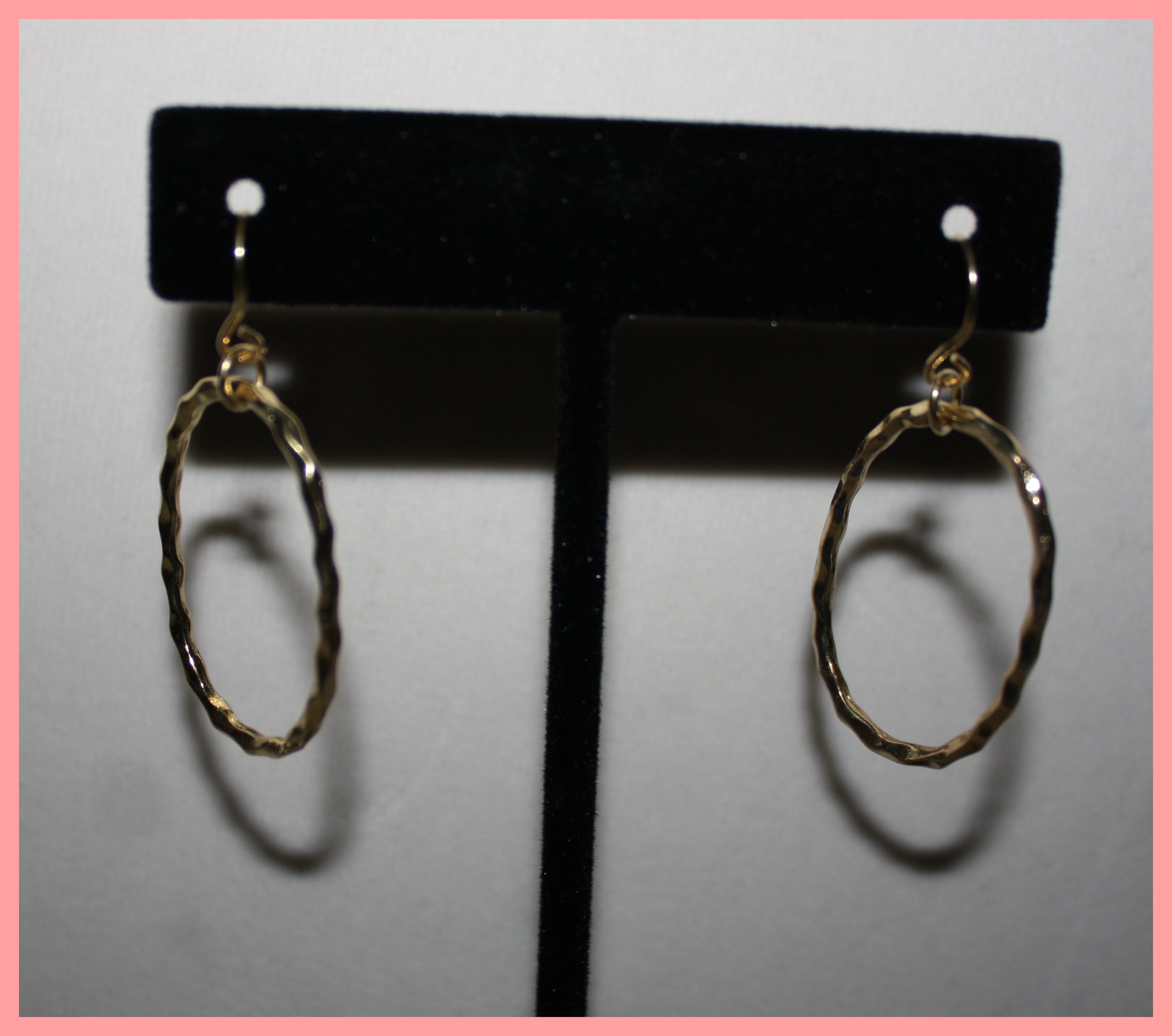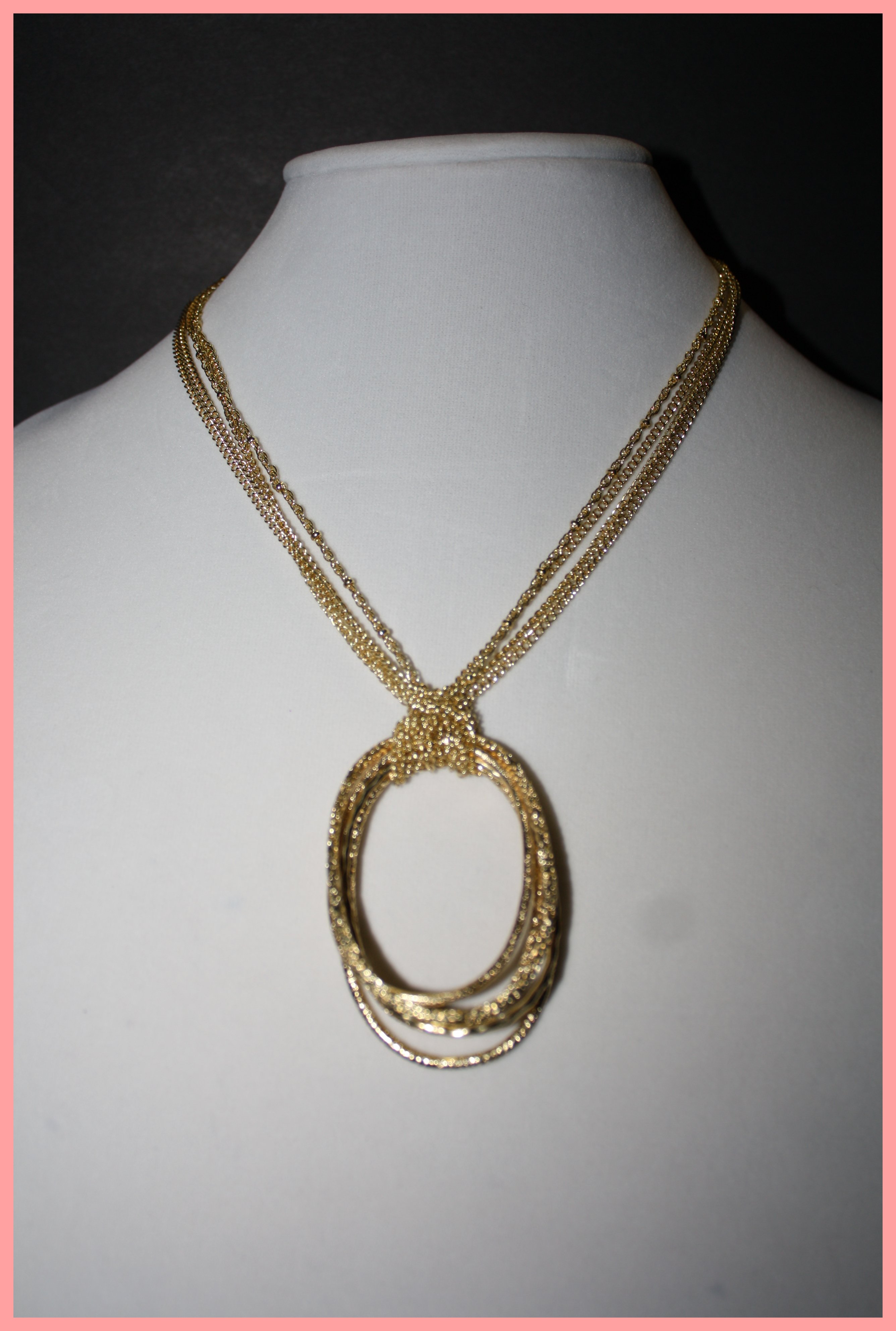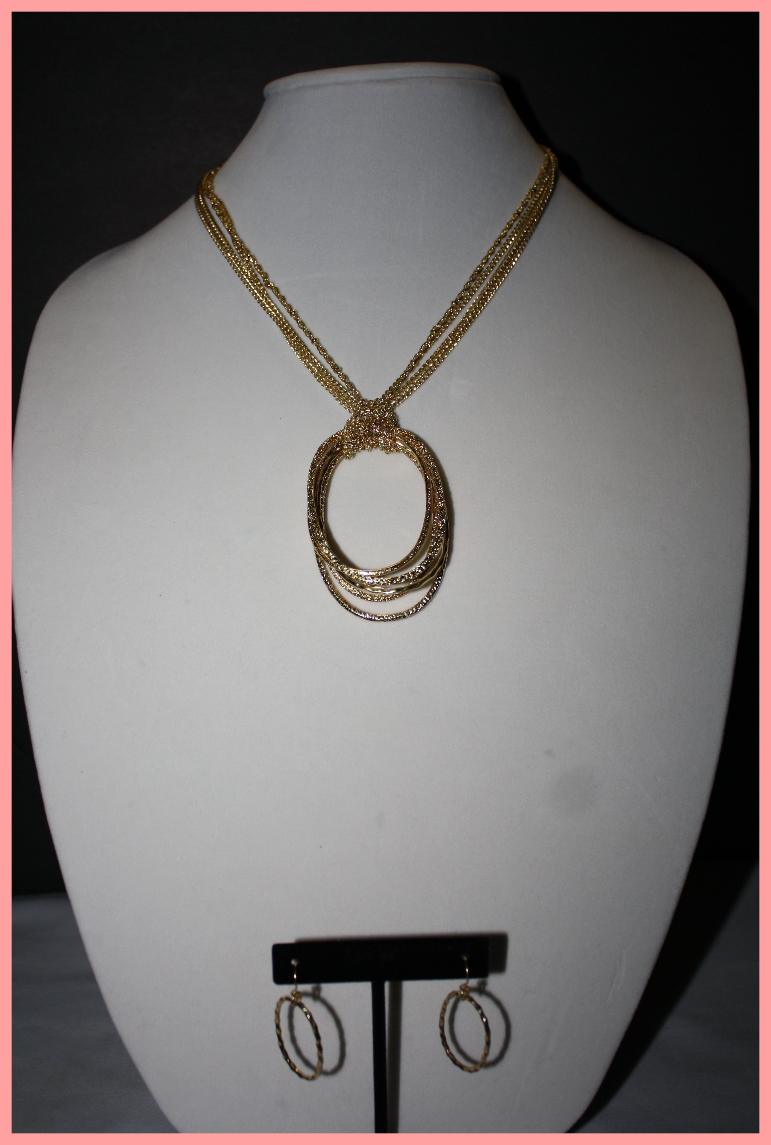 This necklace has gold circles linked together and matching gold earrings. Make a statement and wear this beautiful piece.