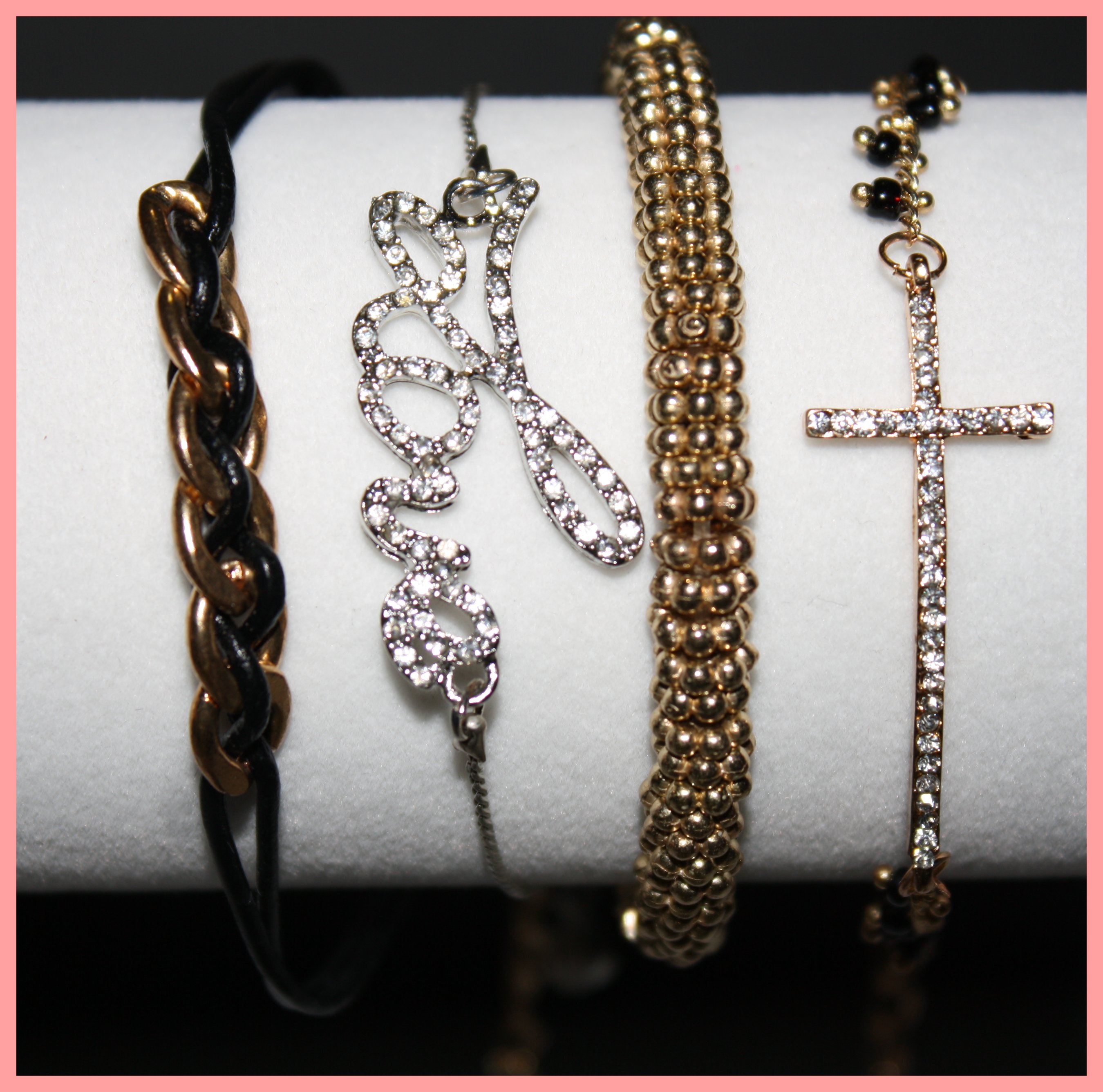 Stackable Bracelets (Gold Cross,Silver Love,Gold Beads, Blk. & Gold chain detail)